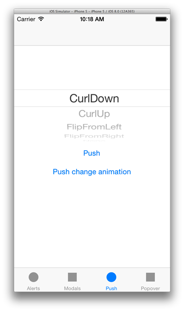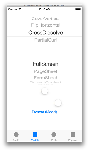 - Modals (presentViewController) – with options for playing with modalTransitionStyle(enum UIModalTransitionStyle) and modalPresentationStyle(enum UIModalPresentationStyle).