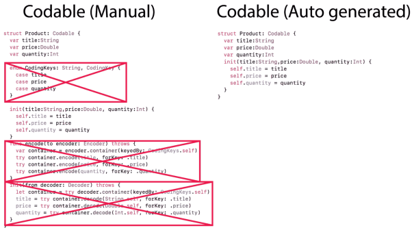• Anyone with experience with Codable is probably screaming about this advantage at the screen by now! So…the magic of the Codable protocol is that it has the power to automatically generate both of its required methods (encode and init) and the CodingKeys enum. If you’re after a straightforward encoding/decoding of Codable properties in your type, you can leave these out, and allow the compiler to auto-generate them, wow!