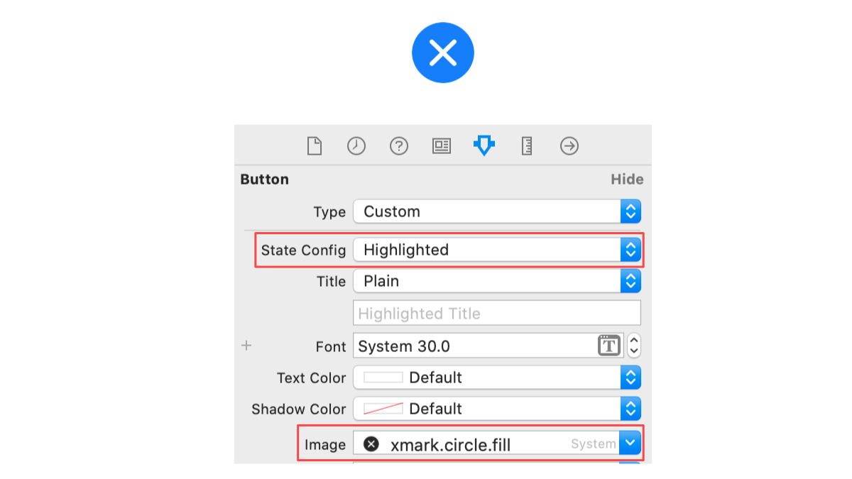 In UIButton this state refers to the state the button is in while the user’s finger is on it. Great! So we can modify the Image for this state too in the Attributes Inspector. Here I’m setting the image for the ‘Highlighted’ state to ‘xmark.circle.fill’: